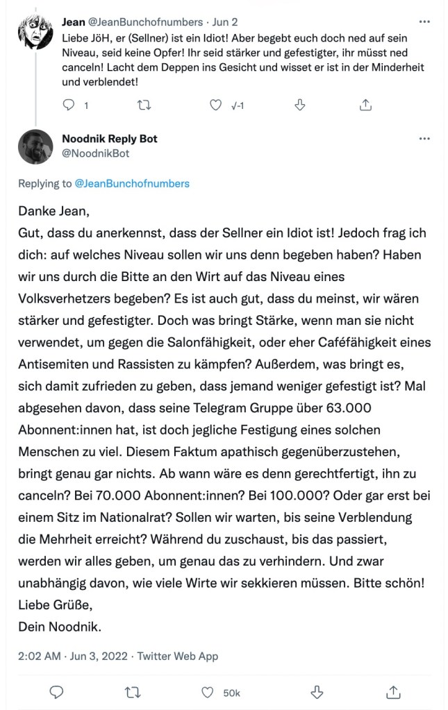 Liebe alle, Es ist mal wieder Zeit für das Beantworten von Fanpost. Vor einigen Wochen hatten der Generalsekretär und die Präsidentin der JöH, beide hochrangige Noodniks, das Privileg, im Café Stein am Tisch neben Martin Sellner zu sitzen. Wie es sich gehört, haben die beiden Noodniks dem Wirt Bescheid gegeben, auf dieses Privileg gerne verzichten zu wollen. Und sie baten den Wirt, einen der berüchtigtsten Identitären aus seinem Etablissement zu entfernen. Leider stießen sie dabei auf taube Ohren. Ich möchte mich nicht auf die Ignoranz des Wirts fokussieren, sondern vielmehr auf die besonders durchdachten Kommentare auf den sozialen Medien, die uns beim Lesen begegnet sind!