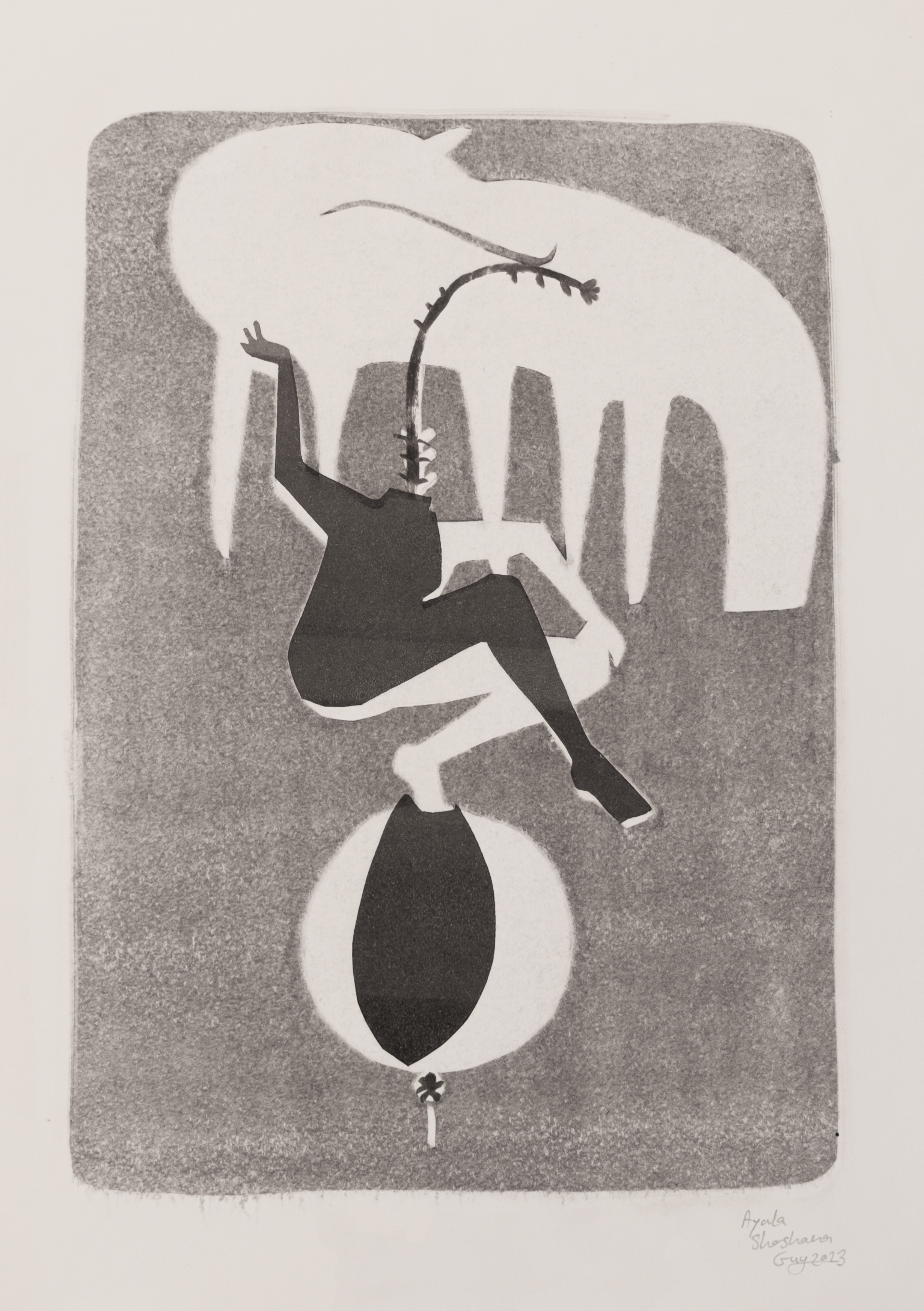 Ayala Shoshana Guy (*1992), israelisch-deutsch-österreichische Künstlerin. Studium an der Bezalel Academy of Arts and Design in Jerusalem und an der Academy of Fine Arts Leipzig, lehrt aktuell an der Universität Passau. Ihre Bild- und Filmarbeiten werden international gezeigt, sie ist Trägerin zahlreicher Auszeichnungen, unter anderem des Birgit Jürgenssen Preis 2024.In ihren Werken nutzt Guy verschiedene Möglichkeiten der Monotypie-Technik, ein Druckverfahren, das keine Replikate kennt und nur Unikate erzeugt. Sie untersucht dabei Fragen des Alltäglichen, in denen sich viele Antworten finden über die Beschaffenheit des Selbst und der Gesellschaft. Dabei werden mediale Grenzen überschritten.